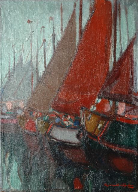 Gerrit van Duffelen | Aangemeerde botters in een IJsselmeerhaven, olieverf op doek, 40,2 x 29,3 cm, gesigneerd r.o.