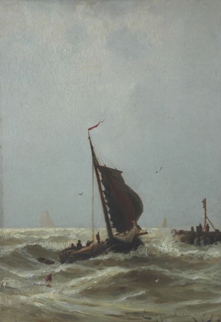 Jacob Eduard van Heemskerck van Beest | Zeilschip op woelige zee bij een havenhoofd, olieverf op paneel, 50,1 x 34,9 cm, gesigneerd r.o.