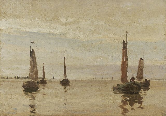 Willem Bastiaan Tholen | Botters in een windstilte, olieverf op doek op paneel, 27,7 x 38,2 cm, gesigneerd l.o. en gedateerd '26