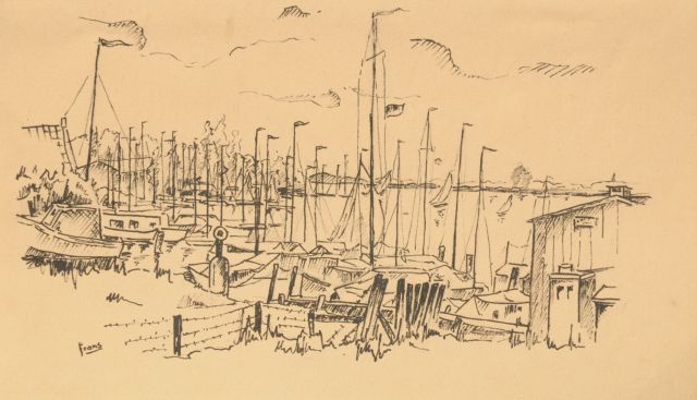 Frans Letanche | Jachthavenscene, pen en inkt op papier, 17,8 x 30,7 cm, gesigneerd l.o. en verso