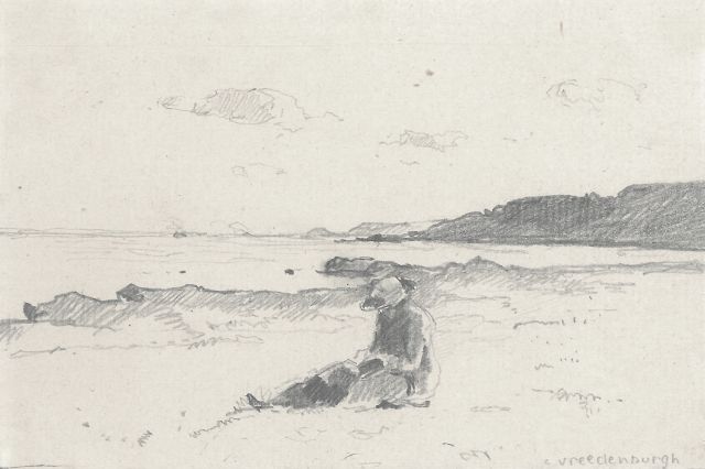 Breiend vissersmeisje in de duinen van Katwijk (alleen tezamen met pendant)