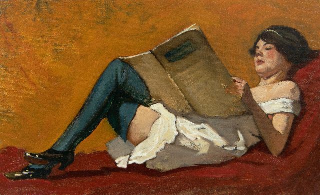 Eduard Houbolt | Lezend meisje op een divan, olieverf op doek op paneel, 18,8 x 29,9 cm