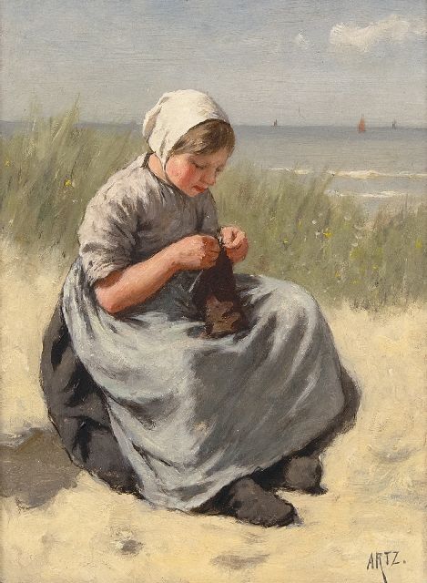 David Artz | Breiend vissersmeisje in de duinen van Katwijk  (alleen tezamen met pendant), olieverf op paneel, 22,5 x 16,3 cm, gesigneerd r.o.