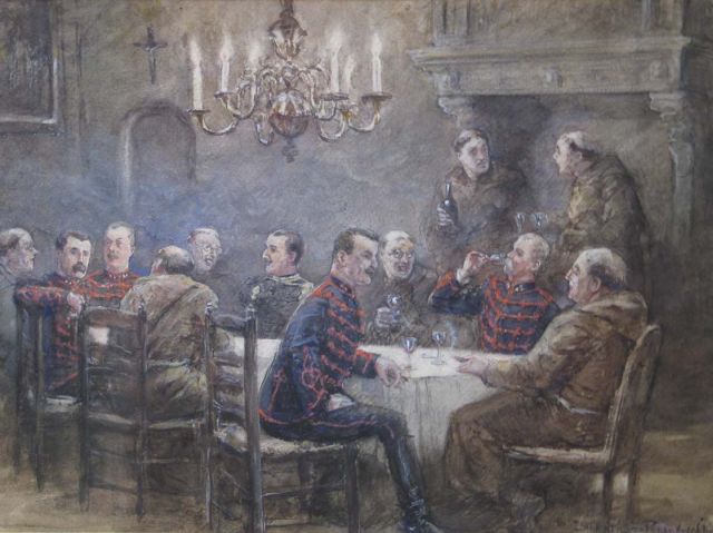 Officieren van het 1e Regiment Huzaren en een Gele Rijder te gast in een klooster