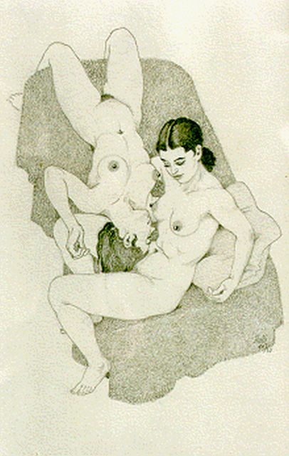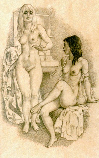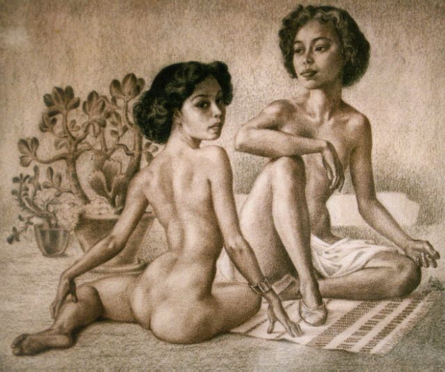 Huib de Ru | Twee naakte Oosterse vrouwen, potlood op papier, 34,5 x 41,0 cm, gesigneerd r.o.