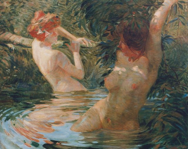Antoine Calbet | Twee baadsters in een bosvijver, olieverf op doek, 80,7 x 100,0 cm, gesigneerd r.o. en gedateerd 1914