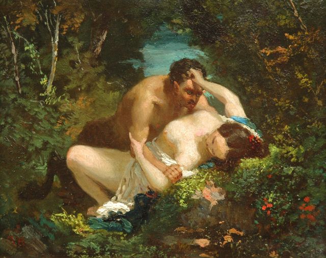 Franse School | Nimf en faun, olieverf op doek, 20,0 x 24,6 cm, gesigneerd l.o. met monogram