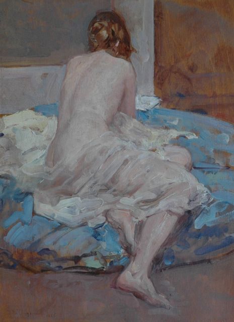André Cluysenaar | Zittend vrouwelijk naakt met boek (pendant van 12799), olieverf op paneel, 32,6 x 23,9 cm, gesigneerd l.o. en gedateerd 1925
