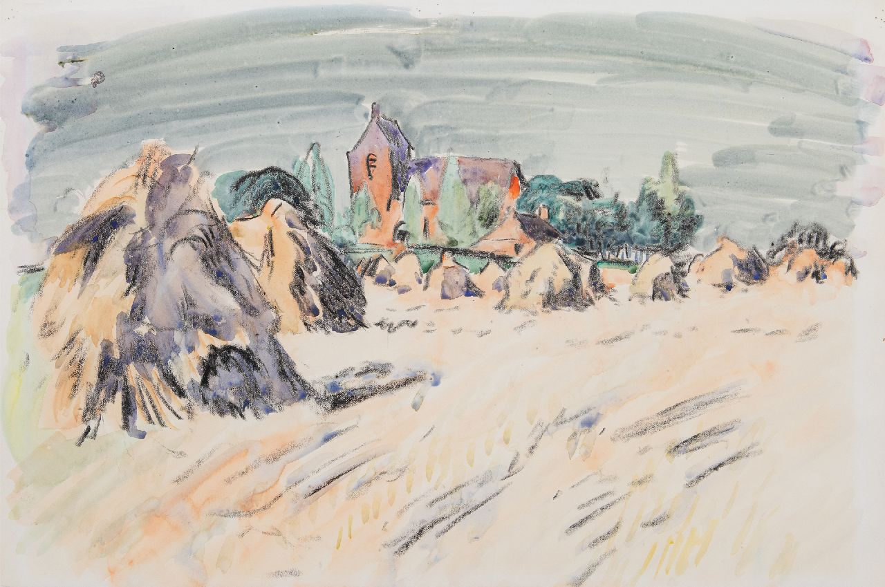 Jan Altink | Zomerlandschap met het kerkje van Oostum, krijt en aquarel op papier, 41,2 x 59,7 cm