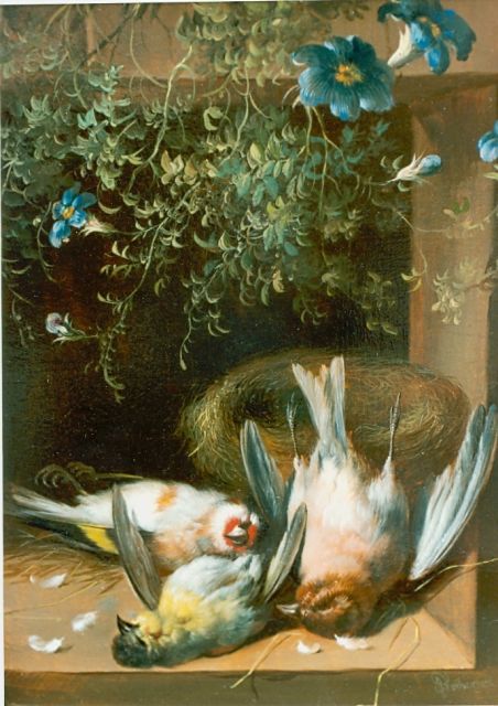 Albertus Verhoesen | Stilleven van zangvogeltje, nestje en bloemen, olieverf op paneel, 27,0 x 20,2 cm, gesigneerd r.o.