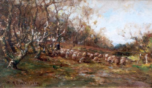 Willem Hendrik Eickelberg | Herder met zijn kudde schapen, olieverf op paneel, 12,8 x 21,5 cm, gesigneerd l.o.