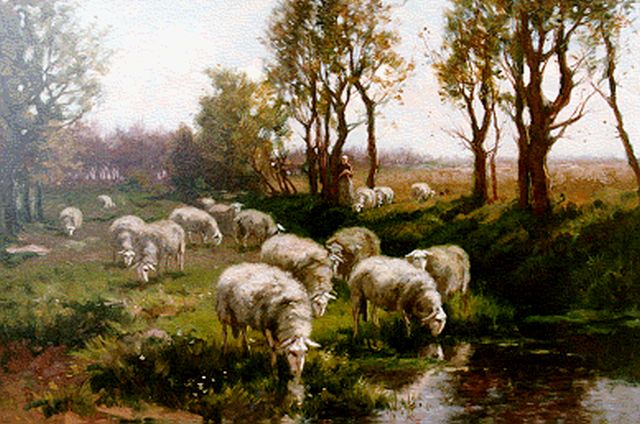 Johannes Karel Leurs | Herderin met kudde schapen, olieverf op doek, 47,5 x 67,5 cm, gesigneerd r.o.