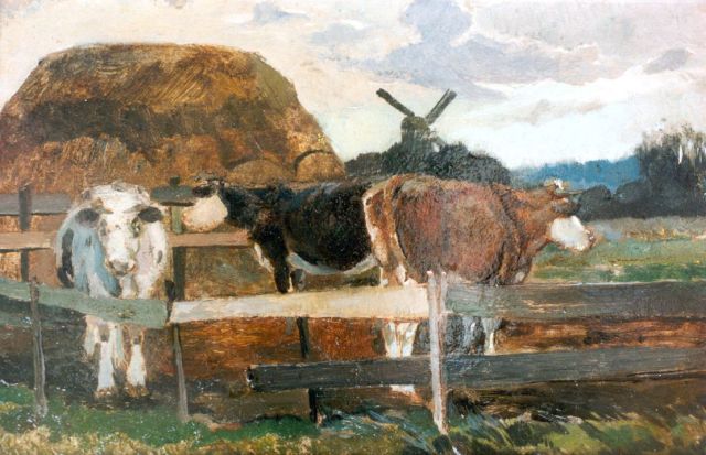 Herman Kruyder | Koeien in de melkbocht, olieverf op doek, 17,7 x 27,5 cm, gedateerd 1911