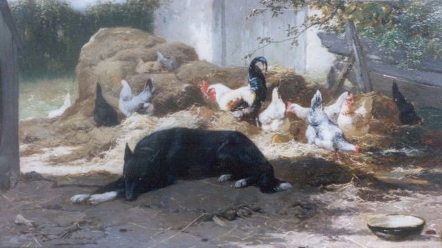Eugène Remy Maes | On duty, hond bewaakt de kippen, olieverf op paneel, 20,5 x 36,0 cm, gesigneerd l.o.