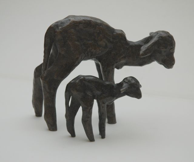 Ernst Baisch | Twee lammetjes, groot en klein, gepatineerd brons, 12,0 x 15,0 cm, gesigneerd met initialen onder de voorpoten