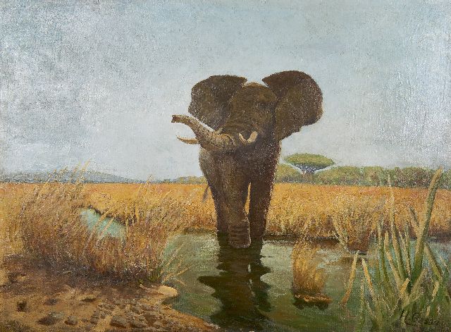 H. Gezda | Wadende olifant, olieverf op doek, 70,6 x 93,0 cm, gesigneerd r.o. en gedateerd '93 [1893]