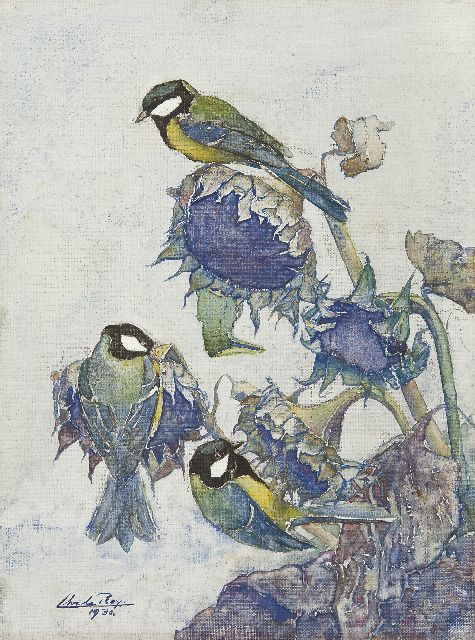Chris le Roy | Koolmeesjes op zonnebloemen, gouache op doek, 39,3 x 29,5 cm, gesigneerd l.o. en gedateerd 1930