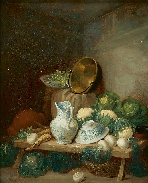 Samuel Smith | Keukenstilleven, olieverf op schildersboard, 21,7 x 17,9 cm, gesigneerd r.o. op rand van tafel