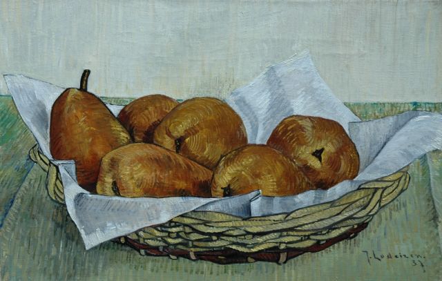 Jo Lodeizen | Mandje met peren, olieverf op doek, 28,7 x 43,6 cm, gesigneerd r.o. en gedateerd '37