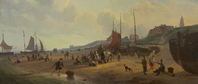 Johannes Evert Akkeringa | Het lossen van de bomschuiten op het Scheveningse strand, olieverf op paneel, 26,6 x 40,1 cm, gesigneerd r.o. en te dateren ca. 1901