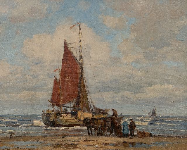Wilhem Hambüchen | Bomschuit en vissers op het strand van Katwijk, olieverf op doek, 60,2 x 80,4 cm, gesigneerd r.o. en zonder lijst