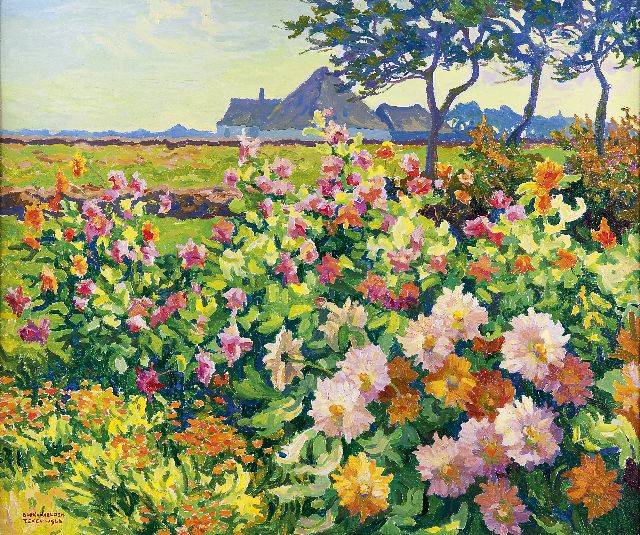 Ad Blok van der Velden | Boerentuintje met chrysanten en dahlia's op Texel, olieverf op doek, 50,3 x 60,5 cm, gesigneerd l.o. en gedateerd 'Texel 1966'