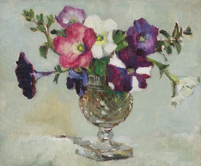 Marie Wandscheer | Bloemstilleven met petunia's, olieverf op paneel, 32,2 x 23,6 cm, gesigneerd l.o.