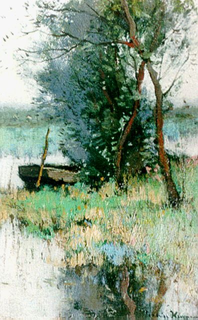 Cornelis Kuijpers | Poldervaart met afgemeerde roeiboot, olieverf op doek, 20,7 x 13,2 cm, gesigneerd r.o.