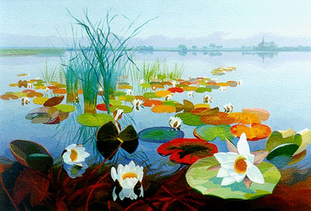 Dirk Smorenberg | Waterlelies in de Loosdrechtse plassen, olieverf op doek, 50,0 x 60,0 cm, gesigneerd r.o.