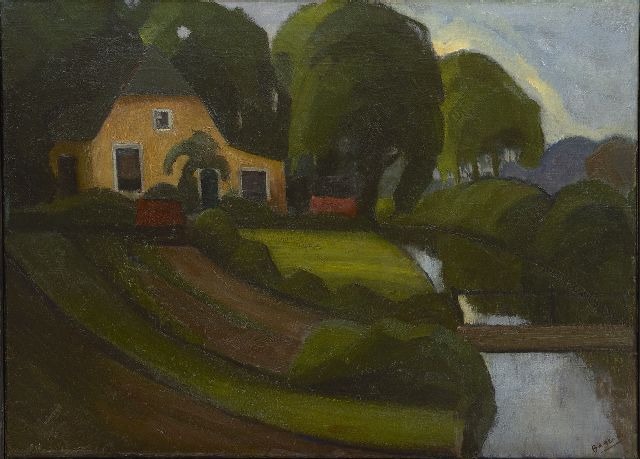 Jan Altink | Afgemeerd scheepje bij boerderijen, wasverf op doek, 43,0 x 54,4 cm, gesigneerd r.o. en gedateerd '29