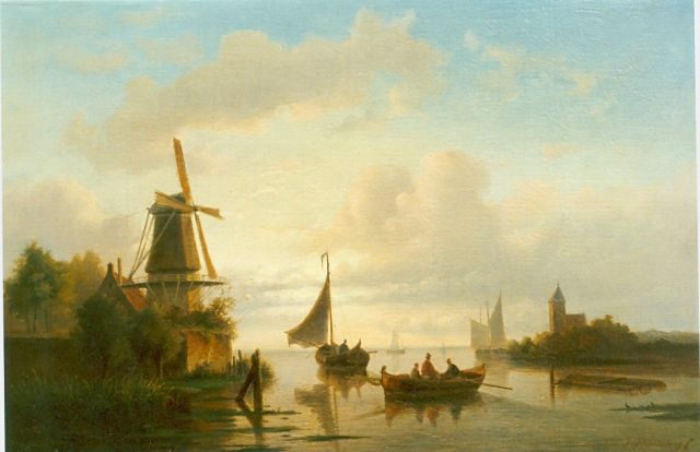 Jacob Jan Coenraad Spohler | Zomers riviergezicht met molenrij, olieverf op doek, 71,3 x 86,0 cm, gesigneerd r.o.
