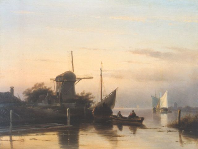 Charles Leickert | Zeilschepen en roeiboot op stil water, olieverf op paneel, 24,8 x 32,7 cm, gesigneerd r.o.