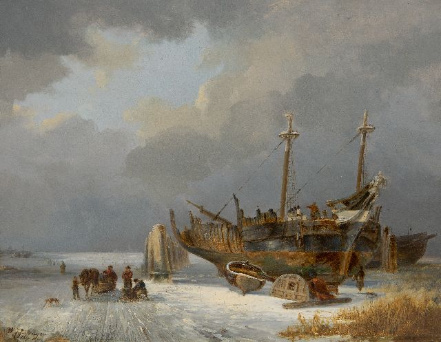 Wijnand Nuijen | Hollands ijsgezicht met figuren en scheepswerfje, olieverf op paneel, 23,4 x 29,8 cm, gesigneerd l.o. en gedateerd 1830