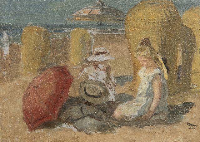 Johan Antoni de Jonge | Kinderen op het strand van Scheveningen, olieverf op schildersboard, 16,0 x 22,0 cm