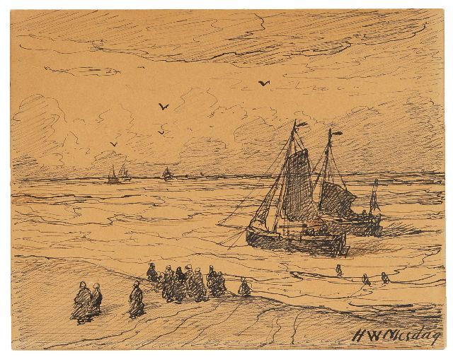 Hendrik Willem Mesdag | Aanmerende bomschuiten, Scheveningen, pen en inkt op papier, 11,4 x 14,5 cm, gesigneerd r.o. en verso gedateerd 3 Nov 1894