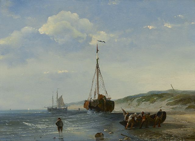Abraham Hulk | Schepen op het strand bij eb, aquarel op papier, 12,6 x 19,9 cm, gesigneerd r.o.