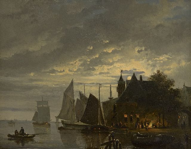 Hendrik Gerrit ten Cate | Veerstoep en aangemeerde zeilschepen bij maanlicht, olieverf op paneel, 25,1 x 32,0 cm, zonder lijst