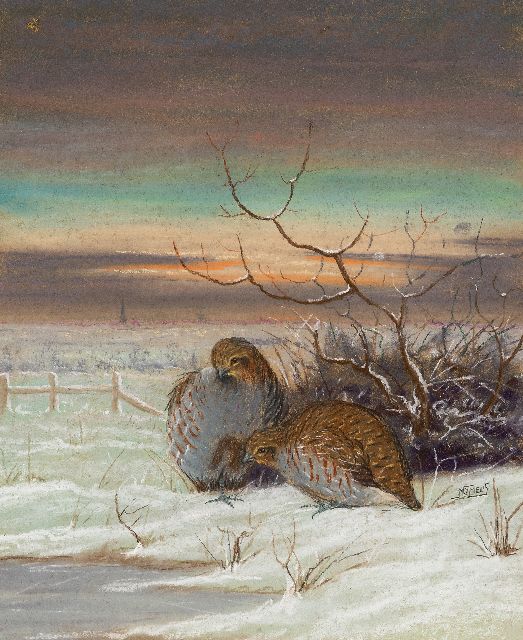 Nicolaas Jan Melis | Patrijzen in een sneeuwlandschap, krijt en aquarel op board, 48,8 x 41,0 cm, gesigneerd r.m.
