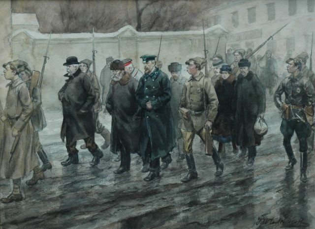 Ivan Alexejevitsj Vladimiroff | Het afvoeren van de gevangenen, aquarel en gewassen inkt op papier, 25,5 x 34,5 cm, gesigneerd r.o. en gedateerd 1918