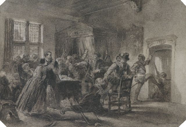 Herman ten Kate | De verstoring van een protestantse godsdienstoefening, zwart krijt, inkt en aquarel op papier, 41,5 x 60,3 cm, gesigneerd r.o. en gedateerd 1863
