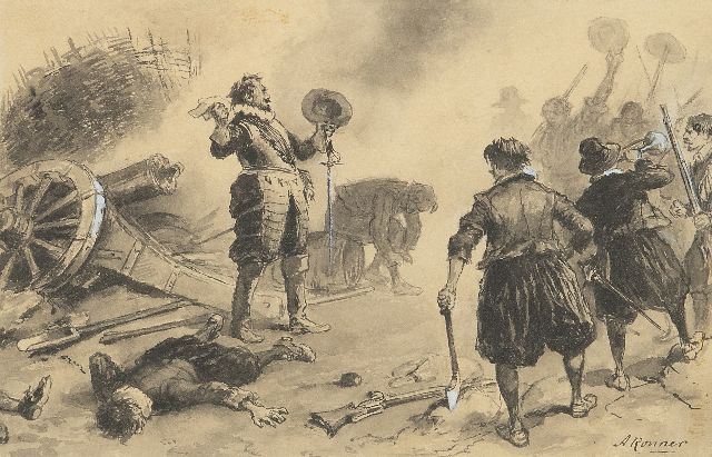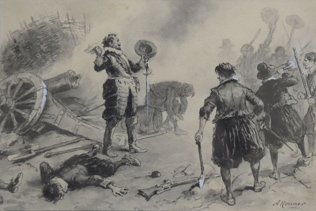 Alfred Ronner | Overwinning op het slagveld (80 jarige oorlog), inkt en gouache op papier, 14,7 x 21,7 cm, gesigneerd r.o.