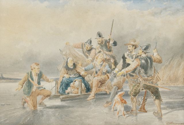 Pieter Alardus Haaxman | Ontsnapping van de moeder van Lambert Melisz in de Tachtigjarige Oorlog, aquarel op papier, 33,7 x 50,8 cm, gesigneerd r.o. en gedateerd '66