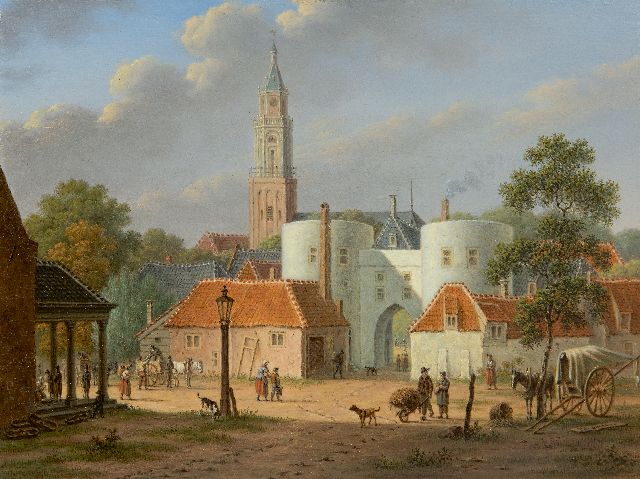 Adrianus Eversen | Zonnig stadsgezicht met stadspoortje, olieverf op paneel, 13,1 x 18,0 cm, gesigneerd r.o. met monogram