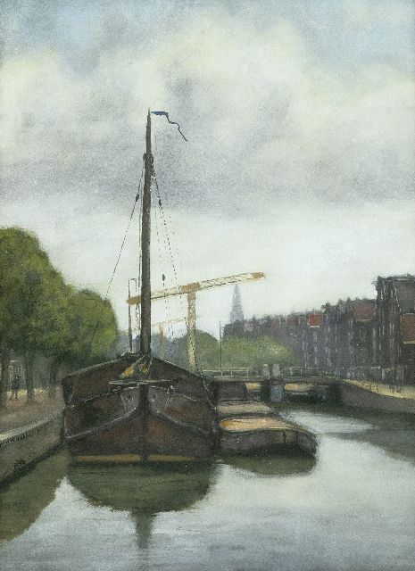 Antonie Waldorp | Stadsgracht met afgemeerde botter, olieverf op paneel, 29,8 x 22,0 cm, gesigneerd l.o. op achtersteven van het schip