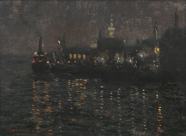 Martin van Waning | Haven bij nacht, olieverf op doek, 30,2 x 40,3 cm, gesigneerd l.o.
