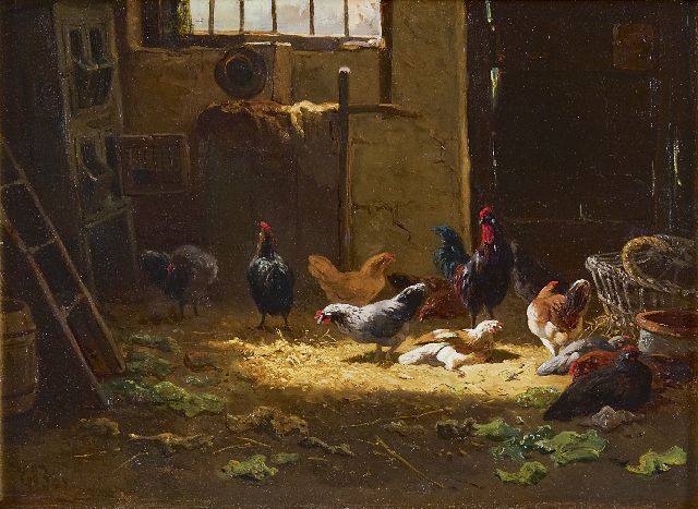 Gerardus Johannes Bos | Pluimvee in een stal, olieverf op paneel, 23,9 x 33,0 cm, gesigneerd l.o.