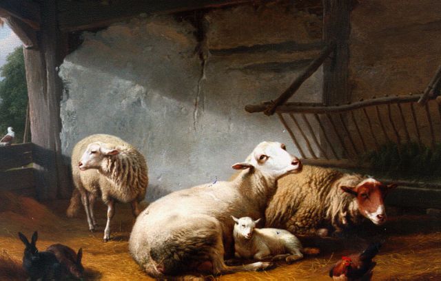 Eugène Verboeckhoven | Pluimvee en schapen in een stal, olieverf op doek, 32,5 x 48,2 cm, gesigneerd l.o. en gedateerd 1860