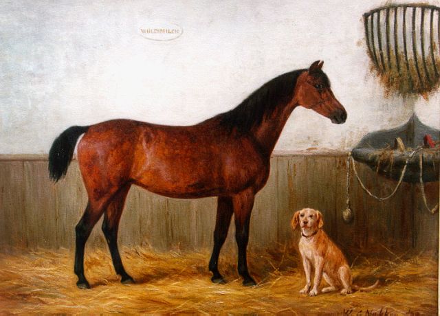 Willem Carel Nakken | Portret van paard 'Wolfsmilch' in stal, olieverf op paneel, 33,6 x 45,0 cm, gesigneerd r.o. en gedateerd '88