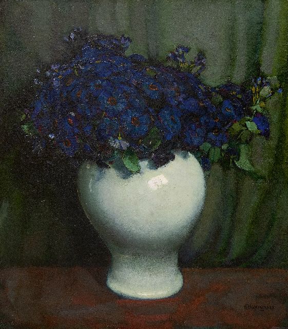 Frans Hogerwaard | Diepblauwe bloemen in witte pot, olieverf op doek, 70,0 x 60,0 cm, gesigneerd r.o.
