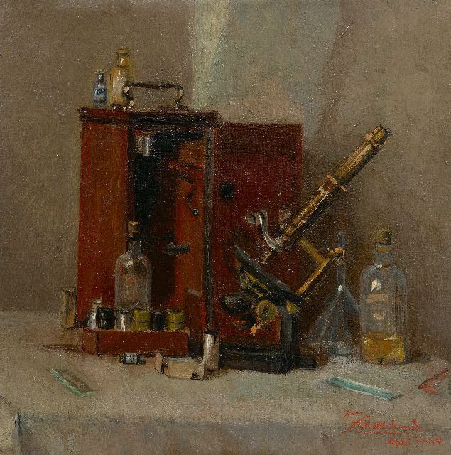 Jan Schellekens | Stilleven van apothekersinstrumenten, olieverf op doek, 25,0 x 25,0 cm, gesigneerd r.o. en gedateerd April 1944